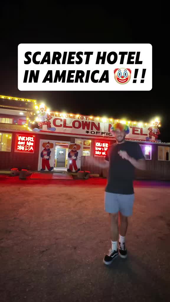 这是美国最吓人的酒店,丑角旅馆。不仅到处都是七千个小丑,;而且据说还被恶灵所困扰。;这个酒店真的存在吗?这是某种病态的玩笑吗?我们去登记入住看看吧。我住在小丑 Pennywise 套房,所以我很幸运,房间里到处都是 Pennywise 的大照片。;有它在旁边,真是难以入睡。此外,这个骷髅会让我做噩梦。我买了一套小丑服装,希望能作为一个好兆头,更好地融入小丑们,也许他们就不会那么捉弄我了?;我不知道。现在我看起来就是傻。小丑博物馆显然是大多数闹鬼事件发生的地方。我跟酒店的工作人员聊过,他们说鬼会拉他们的头发。;跟着他们到处走,还有更多。这地方的氛围就是...到处都有一种诡异的感觉。;我们可以去隔壁的墓地参加鬼魂之旅。我们的导游让我们下载了一个应用程序,应该能显示鬼魂的轮廓,但鬼魂只是...;我想可以安全地说我不会成为小丑,但如果你出于某种原因在附近,值得停下来看看。再见。